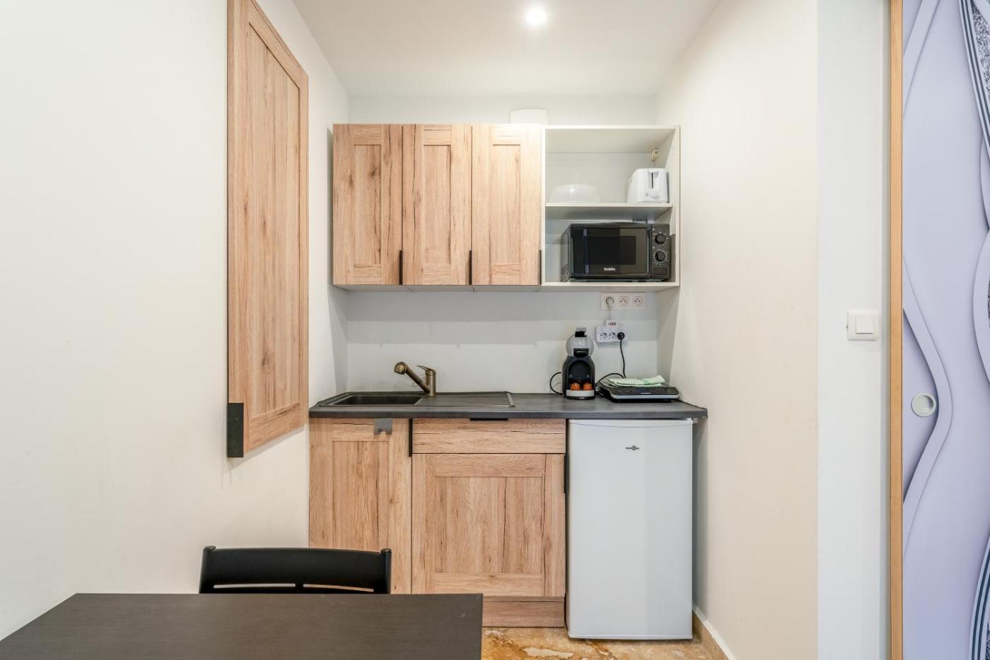 Studio Supérieur. The studio offers air conditioning and a private entrance, as well as a private bathroom featuring a shower. In the kitchen, guests will find kitchenware, a microwave and a toaster. This studio provides a coffee machine and a TV. The unit offers 2 beds.